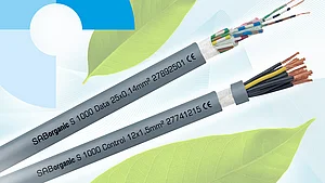 Die schleppkettenfähige, 60°/m-tordierbare Leitung SABorganic S 1000 verfügt über einen Außenmantel aus biobasiertem Polyurethan. Der neue Werkstoff wird aus kurzen, lokalen Lieferketten bezogen und besteht zu 45% aus nachwachsenden Rohstoffen.