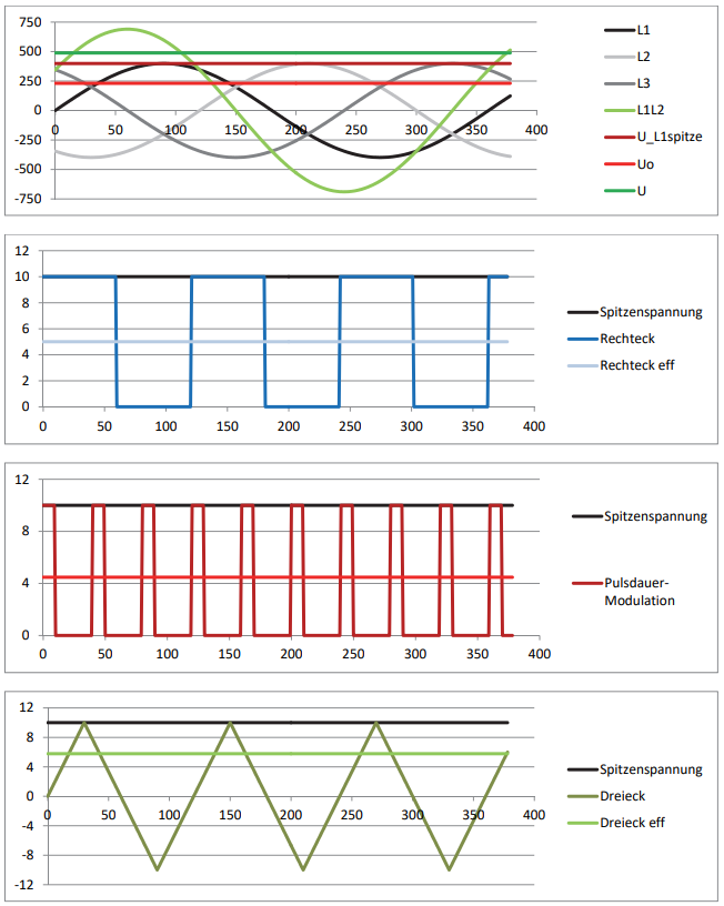 Eine wichtige Größe für die Einsetzbarkeit einer Leitung ist die Angabe der „Spannung”. Abhängig vom Einsatz der Leitung kommen jedoch immer wieder unterschiedliche Spannungsangaben zur Anwendung, die nicht immer miteinander austauschbar sind. Zunächst wird bei klassischen Anwendungen am Wechselspannungsnetz meist der Effektivwert (Ueff) angegeben. Aufgrund des sinusförmigen Spannungsverlaufes entspricht dieser Wert der Belastung, den eine konstante Gleichspannung ausüben würde. Die maximal auftretende „Spitzenspannung” ist fast 50% höher. Die englische Bezeichnung für den Effektivwert ist „RMS” für „Root-Mean-Square”, was die Berechnung des Mittelwertes angibt.
