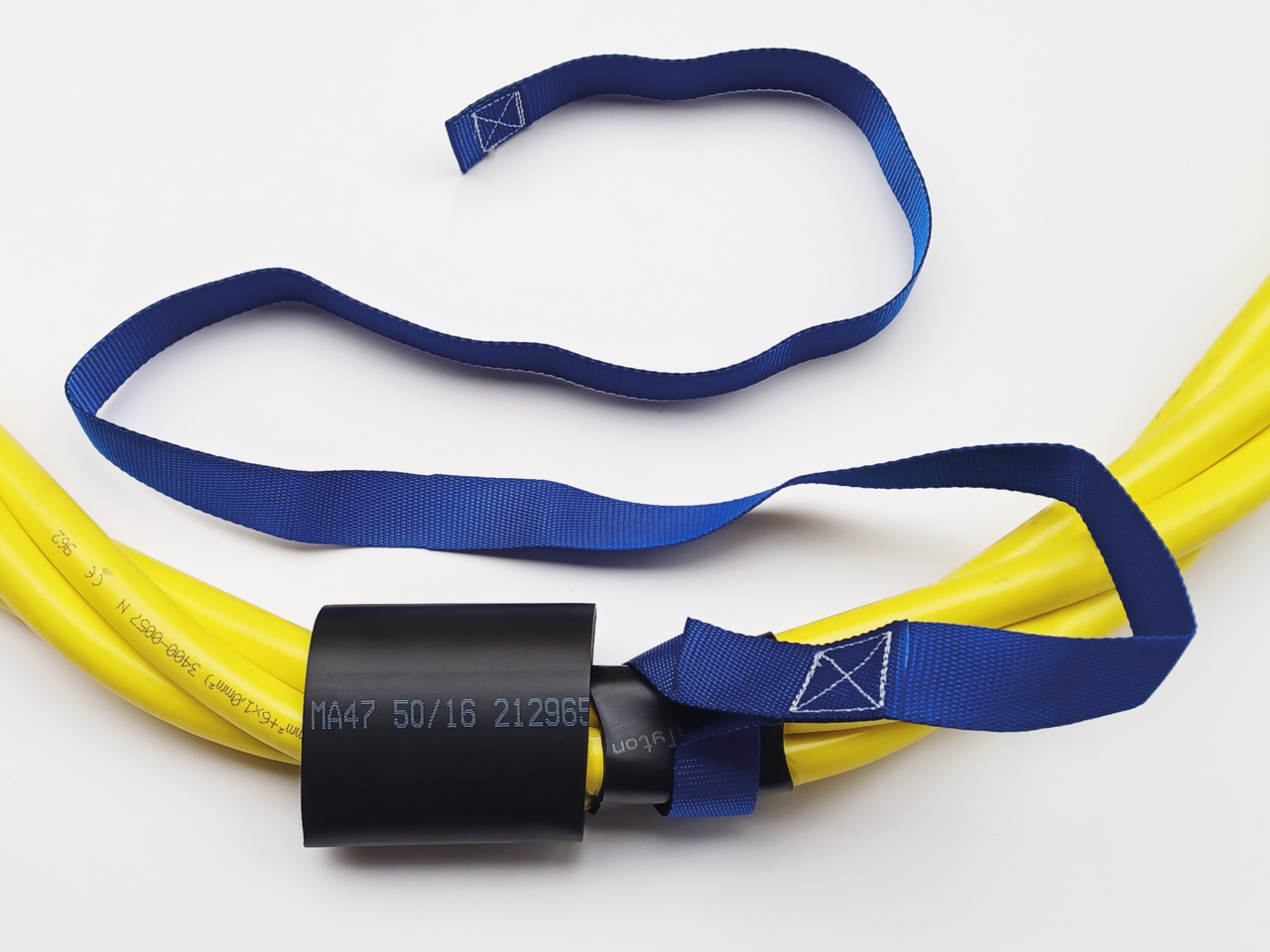 Führen Sie das Gurtband durch die Schlaufe und ziehen Sie es auf dem Schrumpfschlauch fest.