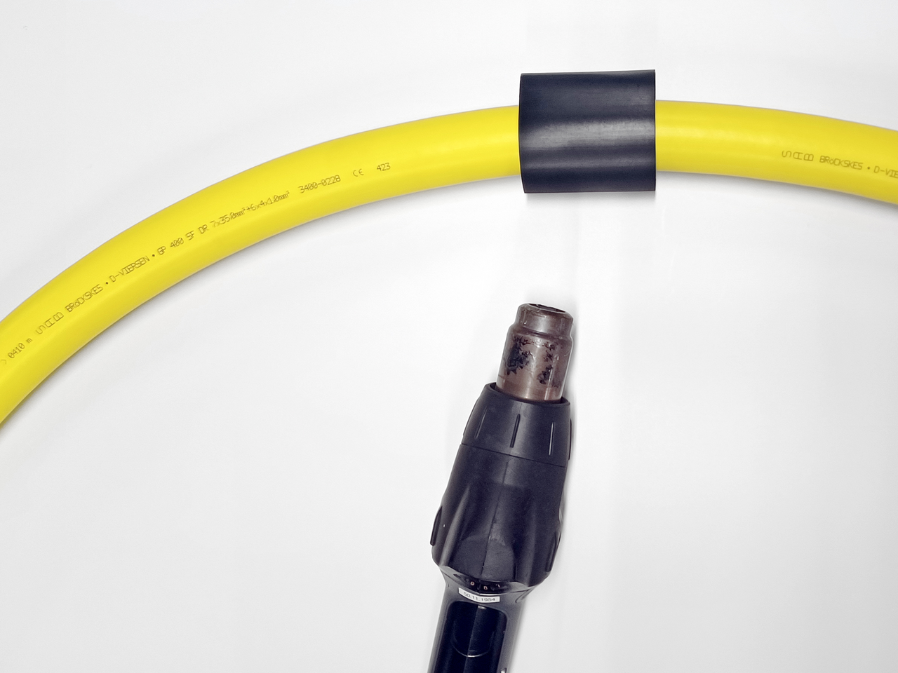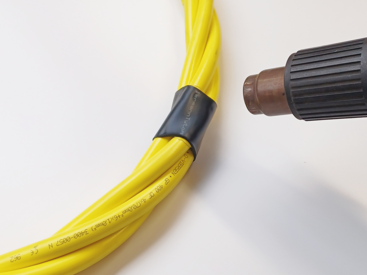 Schieben Sie den kürzeren Schrumpfschlauch auf das Kabel an der Stelle, an der die Zugentlastung montiert werden soll (in der Regel etwa 1 Meter vom Stecker entfernt). Schrumpfen Sie den Schlauch anschließend mit einem Industrie-Heißluftfön.