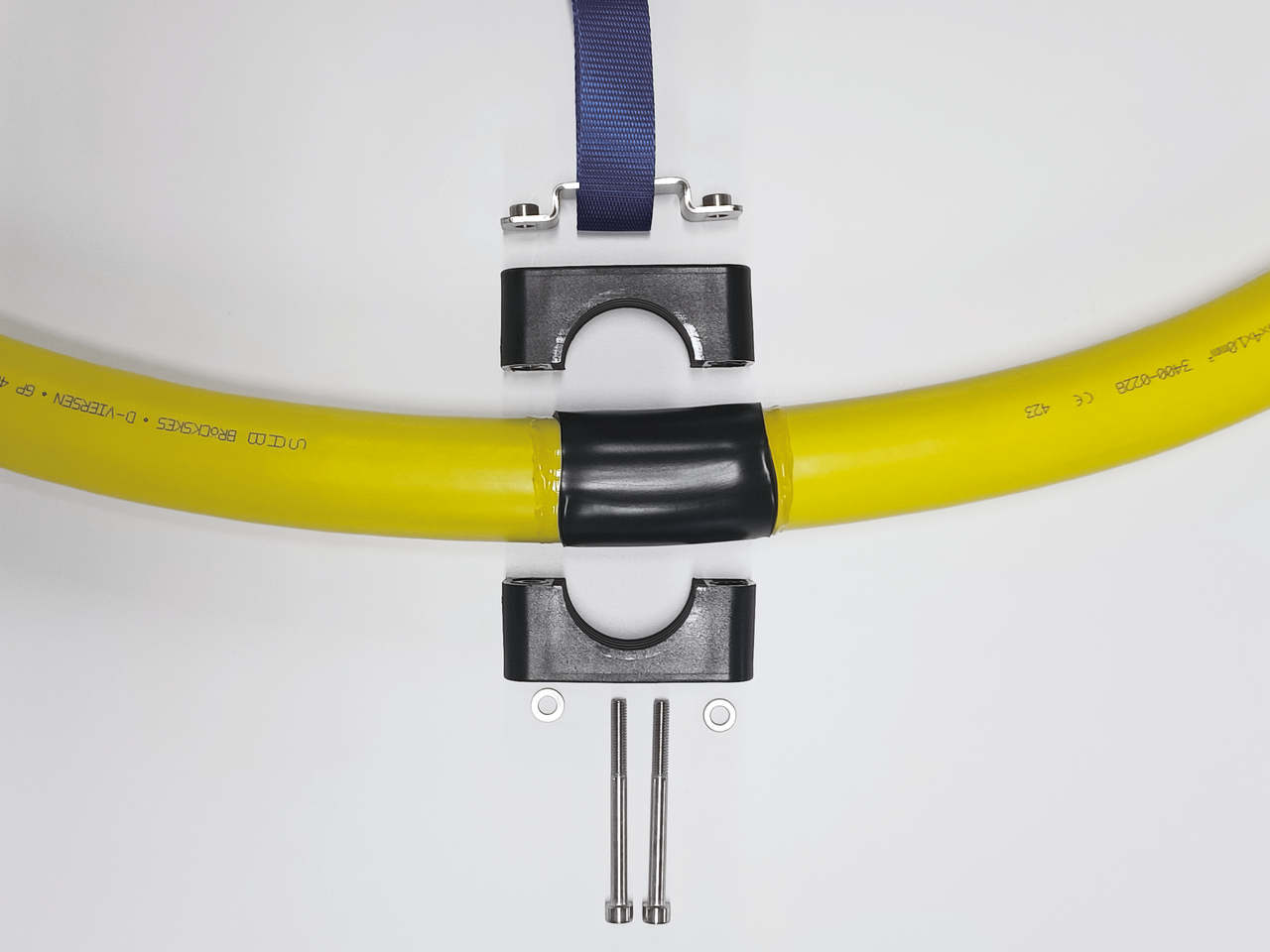 Führen Sie das lose Ende des Gurts durch die Edelstahl-Gurtklemme. Die Zugentlastung ist jetzt einsatzbereit.