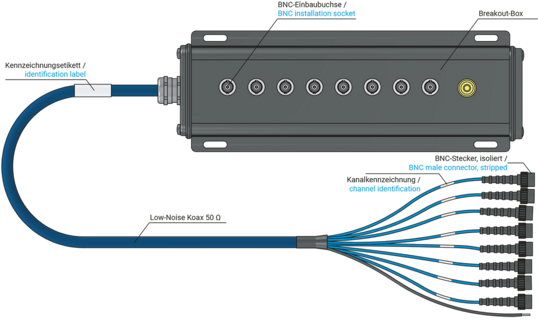 Breakout-Box mit BNC-Multicore-Kabel zur strukturierten und ordnungsgemäßen Verlegung und Erfassung z. B. am Prüfstand