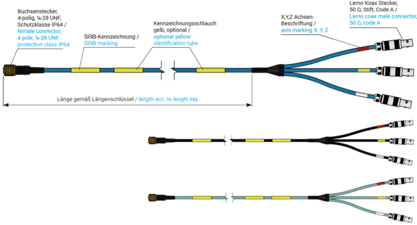 Sensorleitung für triaxiale Beschleunigungssensoren (IEPE) und Anschluss an z. B. Siemens LMS SCADAS Messtechnik.