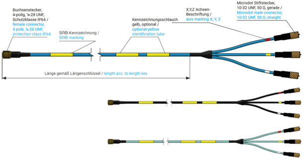 Sensoranschlusskabel für triaxiale Beschleunigungssensoren mit Spannungsausgang (IEPE).