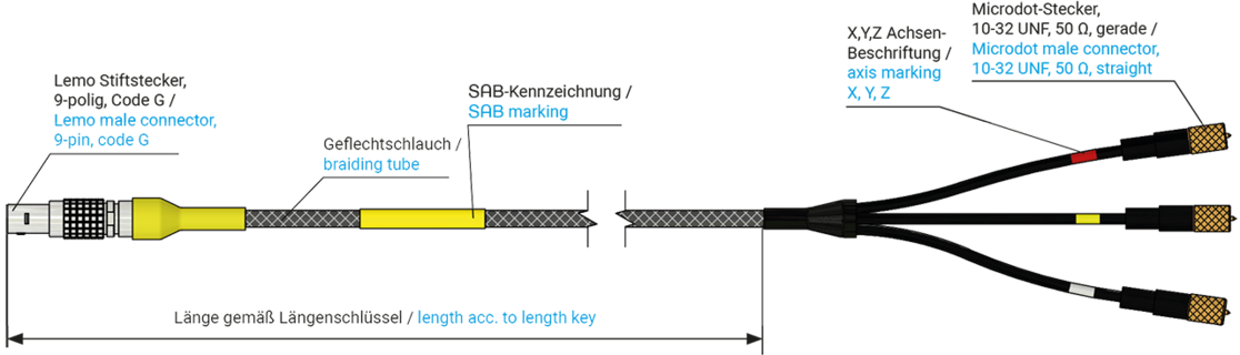 Sensoranschlusskabel für triaxiale Beschleunigungssensoren mit Ladungsausgang (Charge) und Anschluss an z. B. Müller BBM PAK Messtechnik