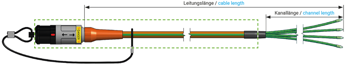 Anschluss- leitungslänge | Länge Kanal 1 | Länge Kanal 2 | Länge Kanal 3 | Länge Kanal 4 | Messspitze | |