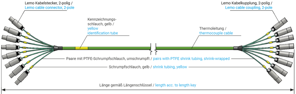 Diese Verlängerung für Thermoelemente basiert auf einer Thermoleitung (8×2×0,22 mm²) mit FEP-Isolierung, Kupferschirmung und einem Temperaturbereich bis +180 °C. Die robuste Konfektionierung mit Lemo-Steckverbindern (FFA/PCA) ermöglicht eine sichere Signalübertragung und ist für eine hohe Anzahl an Steck- und Trennvorgängen ausgelegt. Damit gewährleistet sie eine dauerhaft hohe mechanische und elektrische Robustheit im Mehrkanalbetrieb. Typische Einsatzgebiete sind Prüfstände, Laboranwendungen und die Automobilentwicklung. Leitungslängen sind in Standard- sowie Sonderausführungen verfügbar.