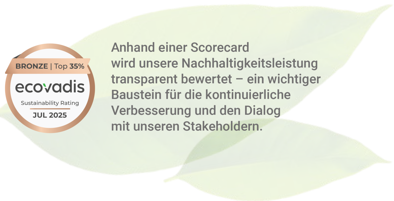 Seit 2024 sind wir auf der Nachhaltigkeitsplattform EcoVadis gelistet. Dort lassen wir unsere Leistungen im Bereich Umwelt und Nachhaltigkeit durch eine unabhängige Drittbewertung prüfen. Die Analyse umfasst: